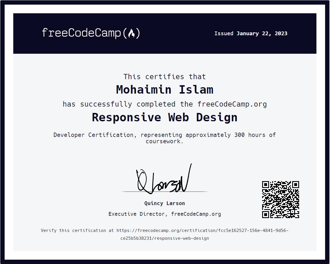 Completed in January 2023* this certification represents over 300 hours of hands-on coursework in modern* responsive web design fundamentals*